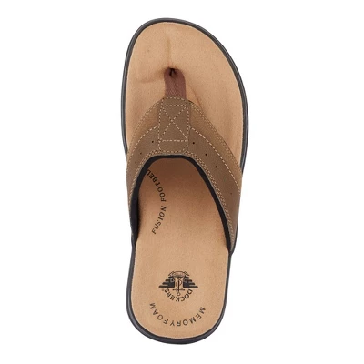 If youโre looking for the perfect pair of flip-flops to slide on with swim trunks, shorts, or jeans look no further. These Dockers sandals are the perfect balance of comfort and style. With a flexible, yet durable outsole, a deep-cushion, memory foam insole, and a roomier, relaxed design these menโs shoes are ready to go all day long. The distressed man-made straps show off your laid-back, casual look and the contrasting textures bring a splash of style to any outfit.